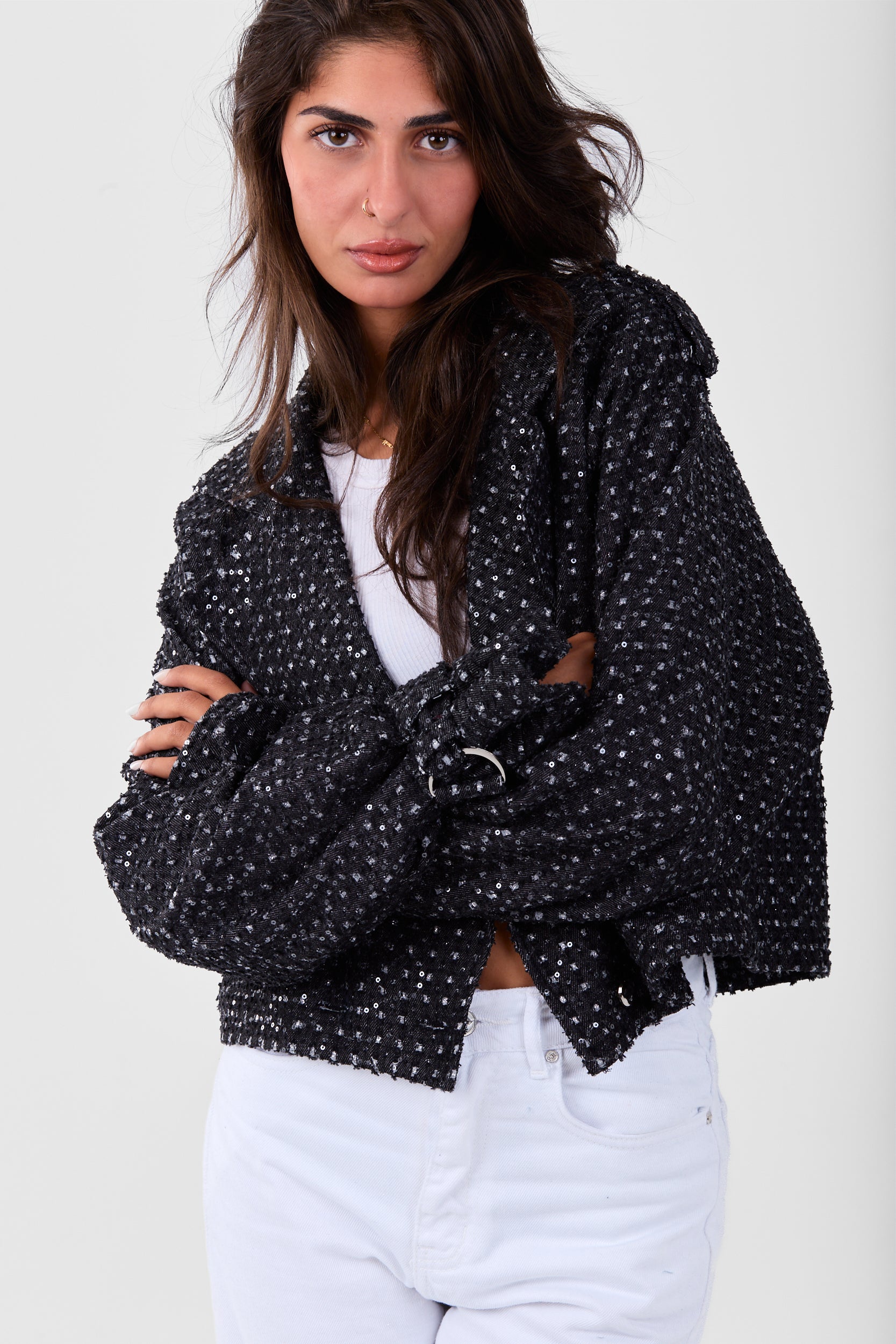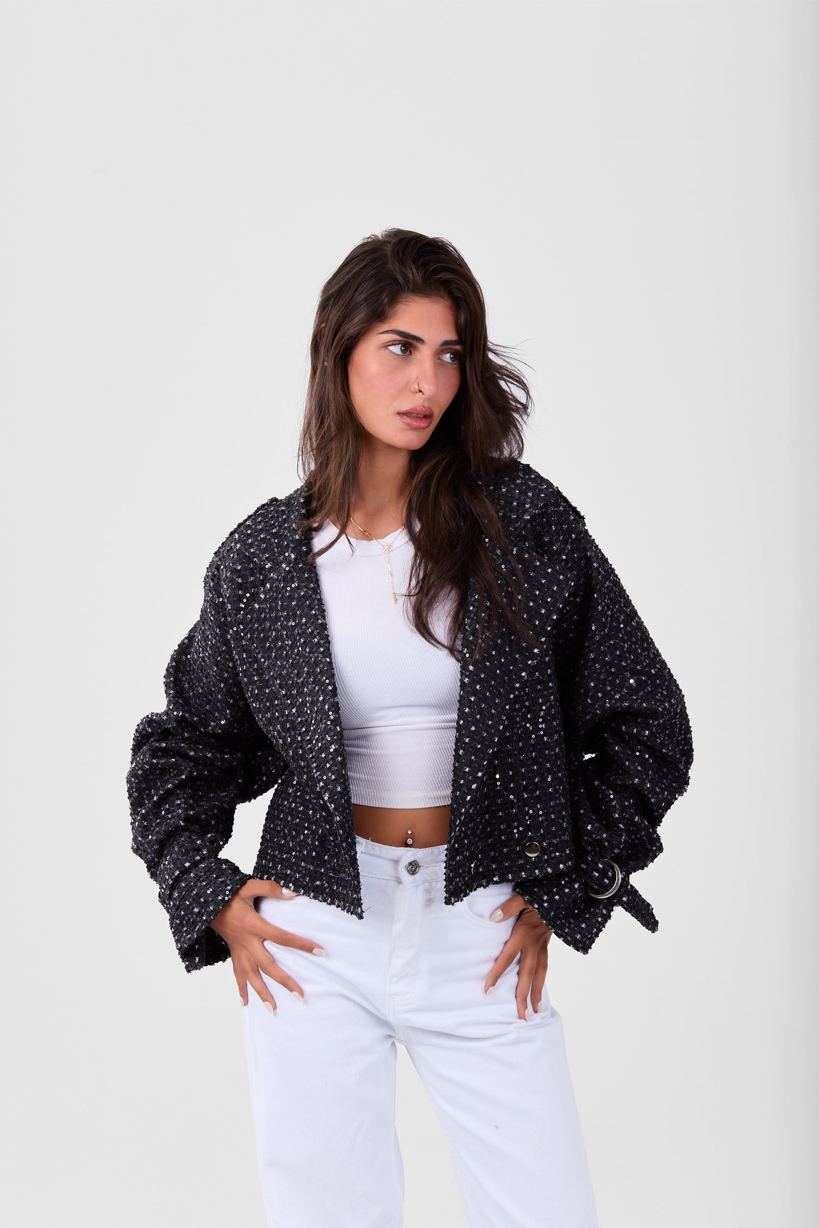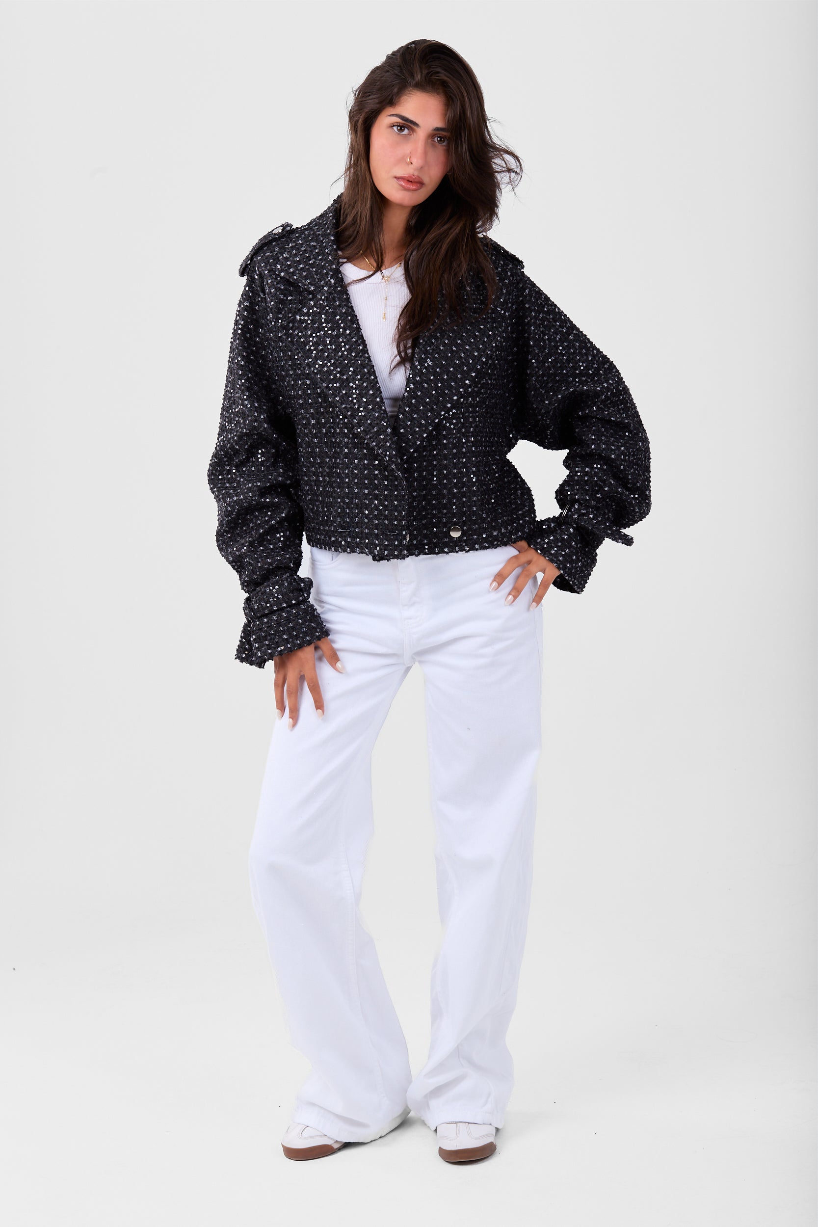 A lightweight cropped jacket with a relaxed fit and textured fabric. Designed with wide sleeves and button details, it’s perfect for layering over casual looks and staying effortlessly stylish on cooler days.