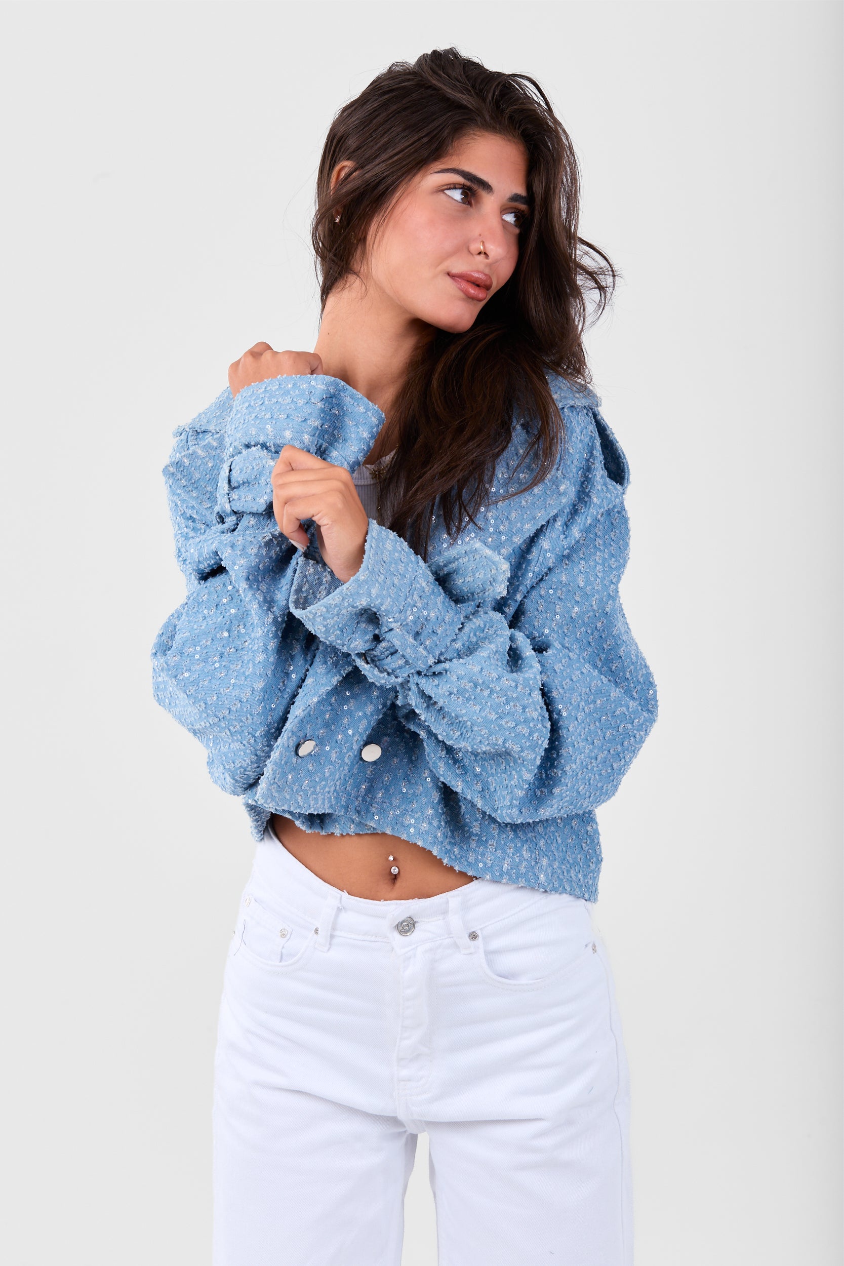 A lightweight cropped jacket with a relaxed fit and textured fabric. Designed with wide sleeves and button details, it’s perfect for layering over casual looks and staying effortlessly stylish on cooler days.