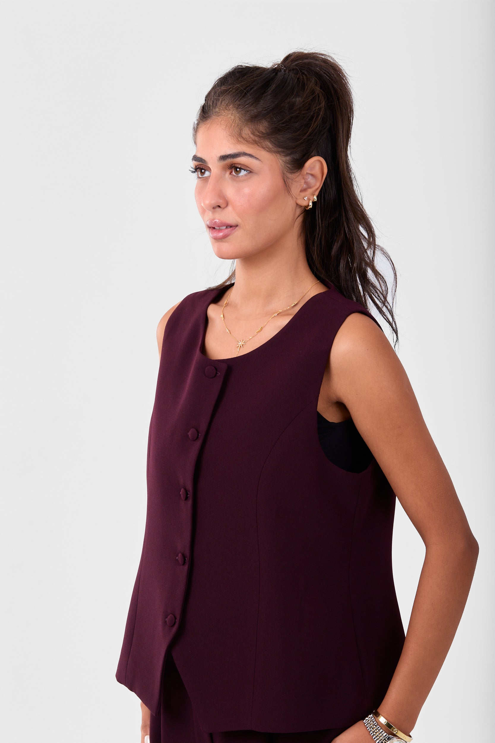 A modern sleeveless blazer that elevates your everyday look. Its clean silhouette and lightweight crepe fabric make it a stylish piece for layering all year round. Wear it over shirts, blouses, or dresses for a sleek finish.